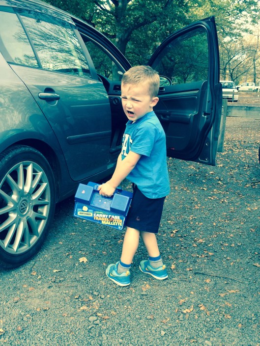 Within two minutes of walking Jackson had had enough carrying his cars. His arms were aching, they were too heavy, he didn’t want to carry them anymore.